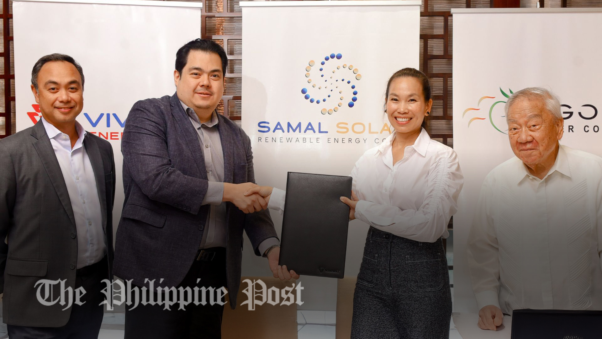 Vivant Energy President & COO Emil Andre Garcia and Tigon Power President & CEO Mayleen Ting share a handshake to mark their long-term partnership for the Bataan Solar Project, witnessed by Vivant Corporation CEO Arlo Sarmiento (left most) and Tigon Power Chairman Elon Ting (right most)